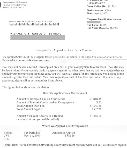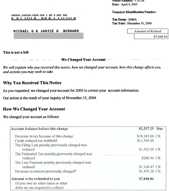 Michael and Janice Bernard had never filed a federal tax return for the year 2000, when in October of 2004, after a long period of increasing threats and demands, the IRS filed liens on their property and commenced garnisheeing more than $1,000.00 per week from Janice's salary. Not knowing what else to do, the Bernards sought out an attorney, who convinced them that filing a return was the only way to end their troubles. With the assistance of this "professional" (and for a considerable fee, no doubt), Michael and Janice prepared a return in the "conventional" (and IRS-preferred) way-- which is to say, without ever having read the law with which they imagined they were complying. This return declared them to owe $3,588.00 over and above what had been withheld from them during 2000 (an amount subsequently recalculated by the IRS to be $3,257.25). The return was submitted without any payment in regard to this additional liability, because the amount was, by that time, more than covered by what had been seized from Janice's earnings.