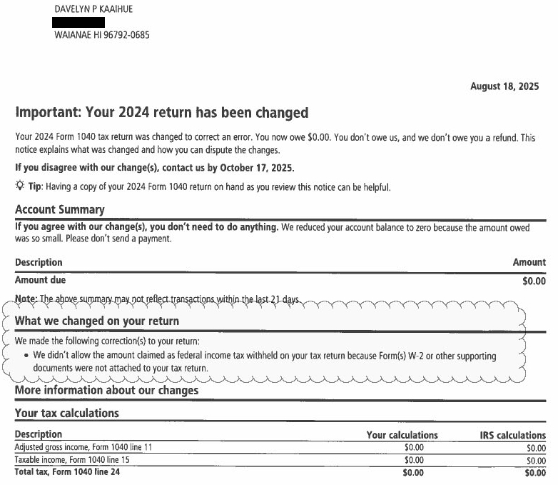 WE'LL END THIS BATCH OF HONOREES with another new warrior for the rule of law, Davelyn (Lyn) Kaaihue, who shares a victory-in-progress for 2024 over a bad-behaving IRS, which has chosen to pretend to not understand Lyn's claim. The agency acknowledges that Lyn did nothing taxable, but denies that she declared anything to have been withheld from her, despite Lyn having done so on the IRS's own form specified for that purpose (and despite the agency having a report from the withholder to the same effect):