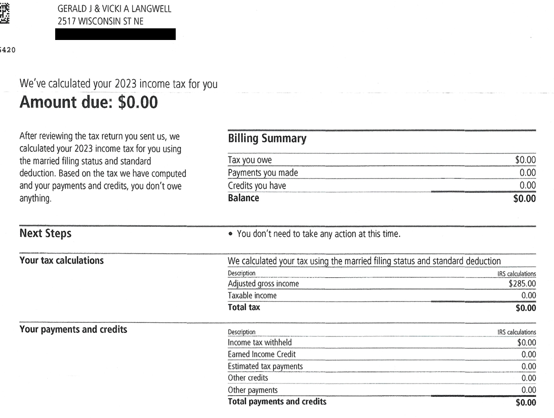 ...as a result of this claim (after a minor bit of bad agency behavior and a well-crafted response); and a black & white agreement by Uncle Sam with Gerald & Vicki's calculations of no income received/no tax owed/no refund due for 2023: