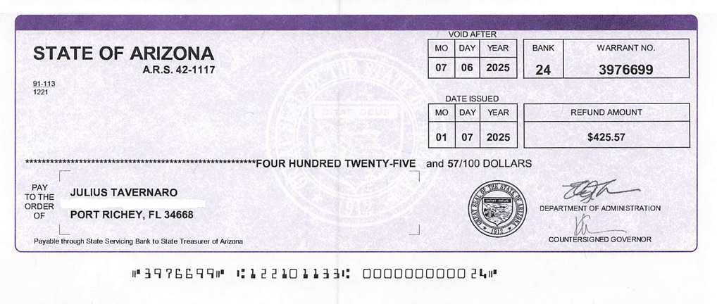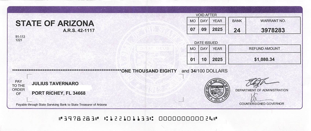 BACK TO THE VETERANS: Julius Tavernaro shares his latest two victories-- complete refunds from Arizona of everything withheld during 2016 and 2017, respectively, by way of amended returns.