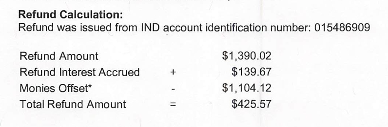 Here is the 2016 refund (which really amounts to $1,390.02 but was dinged with an offset for an outstanding balance owed to the state from some past issue):