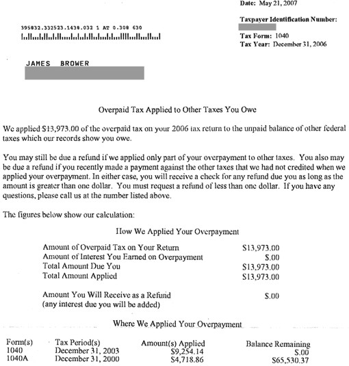 The "Total Payments" and "Amount of Overpaid Tax" listed on this composite of the notice Tony and Bonnie received are incorrect-- amounts had been withheld from them, although only under the FICA (Social Security and Medicare "contributions"). As the amounts to be withheld under that program are measured by the receipt of "wages"-- which this form acknowledges Tony and Bonnie had none of-- this represents a "victory in progress" of the sort discussed here.