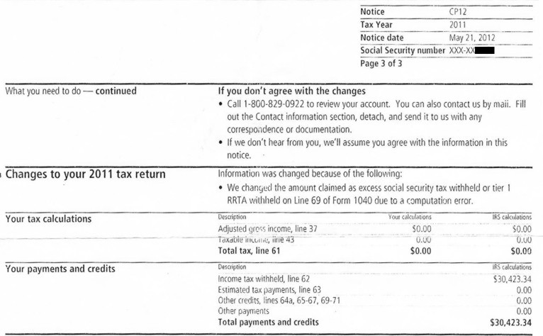 Don't be misled-- while this refund notice makes what the IRS alleges to be owed for a different year the most prominent feature, this is, in fact a notification that Joseph has been refunded everything withheld from him during 2011-- Social Security and Medicare taxes included (see the "Billing Summary" section). The amount has simply been gratuitously diverted to pay off what the government purports to be a debt owed to it by Joseph.