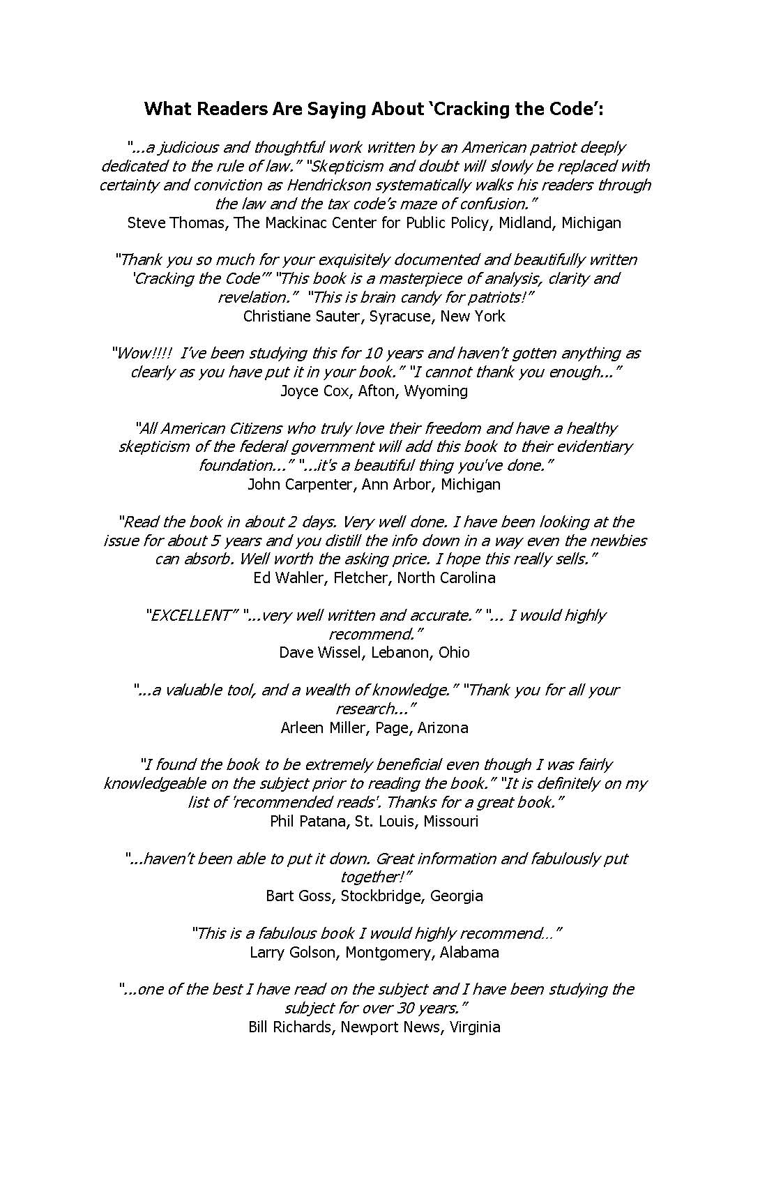 See video testimonials by readers of 'Cracking the Code Read the review of 'Cracking the Code' by Steve Thomas of the Mackinac Center What the federal and state governments have to say about 'Cracking the Code-...'