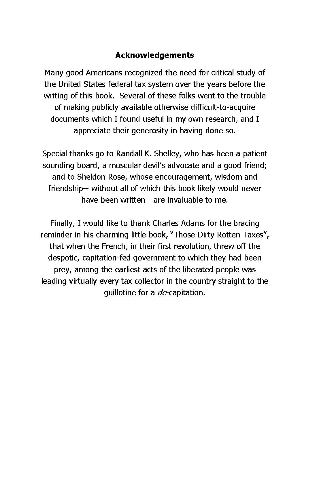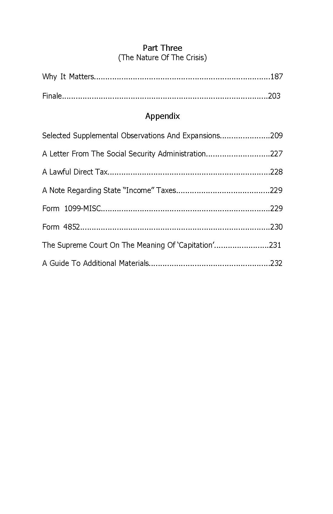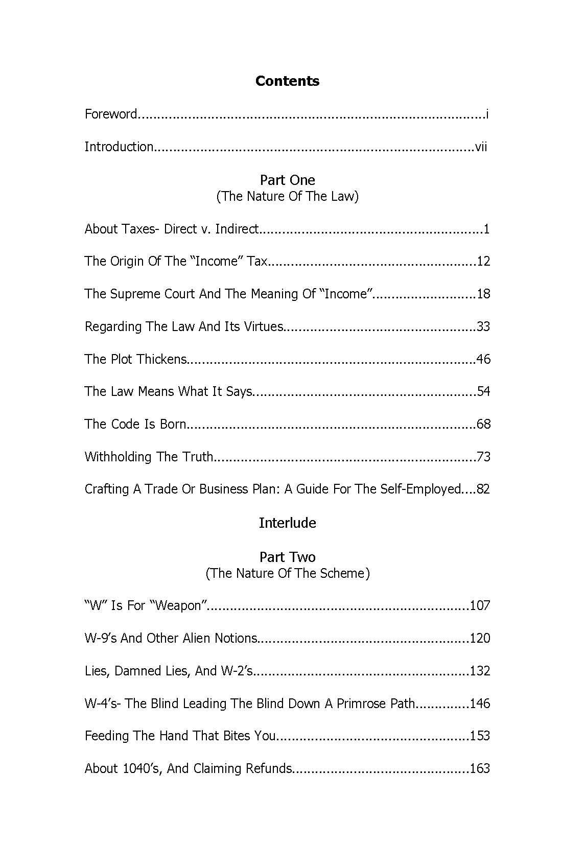 DURING THE SAME PERIOD DESCRIBED ABOVE, CtC was pirated multiple times and passed around the internet as .pdfs (with the copyright page omitted, of course). Shortly before I was sentenced after a seriously kangaroo court proceeding on charges of not believing what I reveal in the book I released an authorized free edition myself, being uncertain at that point of my ability to continue to get this hugely important truth out to the American public going forward. Nonetheless, a lot of folks who became aware of CtC never bothered to actually get the book, relying instead on word-of-mouth representations of its information (often offered by others who themselves had no direct knowledge) which were invariably incomplete, if not outright misrepresentations. In other cases, even folks who HAD "read" the book only paid attention to the portions they thought relevant to their own circumstances, imagining they already understood the tax generally. Or, they didn't fall prey to that disastrous mistake but still failed to make it through the appendix and to the last page. It is there that readers are strongly advised to proceed to the extensive and steadily-growing supplemental material I have spent twenty years posting in increasing depth on LHC-- especially material added in response to the various ploys, dodges, obfuscations and evasions seized on by tax agencies trying to keep the "ignorance tax" gravy train rolling in the face of CtC's revelations. And then, of course, there are many folks who have done everything right but simply have failed to see every new supplemental post as they have been added or updated over the years, since they (understandably) don't live and breathe this subject the way I do, and (less understandably) have failed to diligently read my newsletters announcing or containing these supplements. Finally, there are also folks hungry to learn the truth about the tax but afflicted with visual impairments. These folks have waited for a version of the book accessible to anyone equipped with OCR-capable text-to-speech software. It is to serve the interests of all these folks listed above, and hopefully to dramatically expand the ranks of educated and activated Americans on the field of battle against the enemies of the rule of law that I have decided to release CtC online, for anyone and everyone to read at no charge (although donations and appreciations will be gratefully accepted, and hard copies of the book remain available). FURTHER, AND IMPORTANTLY, I have taken advantage of the opportunity presented by the online format to make this posted version fully annotated, with links to relevant supplemental material throughout the text. Some of these annotations are targeted to specific portions of the text on any given page, as indicated by footnote markers (i.e. "1") with the corresponding link provided at the end of the page. Others are more generally related to the overall subject matter of the page or the chapter, and appear at the end of either such section (but the very last link that appears at the end of each chapter will take you to the next chapter). In a few cases urls that appear in the original text have been hot-spotted into active links. Click on any you encounter to see if they are so treated. REPITITION WILL INEVITABLY BE ENCOUNTERED among these linked supplements-- that is, the reader may find the same supplemental post appearing as a footnote in several different places throughout the book, and/or encounter some of the same material covered in several different supplements. In the first instance this is because multiple aspects of the tax or its administration addressed in CtC necessarily relate to certain core concepts or elements, general American misunderstanding or ignorance of which has been cultivated by the state throughout the lifetimes of every reader. I am unwilling to assume that because I directed a reader to the supplemental material regarding any such concept or element once it will be remembered with sufficient accuracy from that point forward. In the second instance (encountering some of the same material covered in several different supplements) this is due to the fact that the supplemental materials have been written over the course of twenty years as free-standing posts, rather than specifically for the purposes to which they are being adapted here. In that same vein, many (if not all) will end with an exhortation to read CtC... Needless to say, once finished with reading such supplements, simply close the new tab on which they have appeared and continue with the book. Many of the supplemental posts footnoted in the new online book will contain links within their own text (or at the end of it). Clicking on such links is at the reader's discretion, but that discretion should tend toward restraint in new readers of CtC. The supplement to which I have linked in the footnote will contain all that needs to be seen at that point, and maintaining continuity in reading the book is more important than deeper-dives into the subject. Save that pleasure for another time. FINALLY, AT THIS POINT THE FOOTNOTING is in its early stages and will be a work-in-progress for awhile. As longtime members of this community are aware (and as I have suggested above), over those twenty years since CtC first appeared I have written a HUGE amount of supplemental material-- and will continue to do so. Selecting and posting links meriting inclusion will take a lot of time and effort. In fact, the annotating may never be finished until the "ignorance tax" scheme has finally collapsed completely, and that won't happen until a sufficient number of Americans have read CtC. I have now made that reading easier than ever-- and free of charge. Do your part and share this link and some encouragement as widely as you can. NOTE: This book is NOT to be downloaded, or printed, or copied in any other way. Doing any of these things will be both a legal violation and a moral violation. Read 
