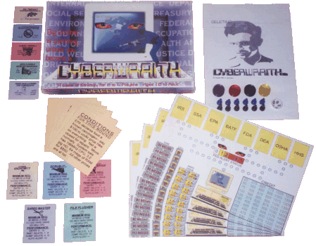 CYBERWRAITH offers the excitement of doing battle with Big Brother himself as the 2 4 players vie with each other to be the first to delete every government file maintained on them, (and thus eliminate the associated taxes, of course). Players work the market in computer hardware and software striving to acquire the fastest, hottest machine with which to hack into the governments systems; deal with lawless company behavior; and cope with ever-changing Federal alert conditions. Every file deleted reduces a players tax burden, putting more money into their hands each turn with which to upgrade their equipment and carry on the battle even more effectively.