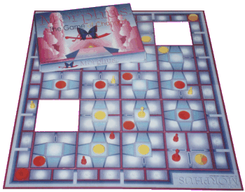 The challenge of DOUBLE MORPHUS is unlike any other, as each player designs and redesigns the two-level maze of the gameboard throughout play, seeking energy for themselves and exhaustion and defeat for the enemy. This is a truly sweaty-brow contest for two players of advanced skills, pitting the contestants powers of multi-dimensional reasoning against each other in the heady environment of a constantly shifting labyrinth. This new game expands on a theme first explored in the highly popular classic MORPHUS. But the two-level playfield of DOUBLE MORPHUS places even greater demands on the duelist's skills.