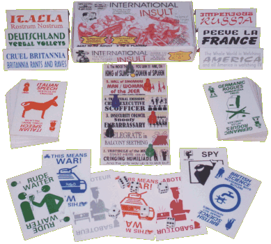 INTERNATIONAL INSULT-- the Game of Bare-Fanged Diplomacy- turns you into a diplomat representing one of the Great Powers of pre-World War 1 gathered with your counterparts from other countries in a neutral spot for dinner. Being the haughty sorts that you are, the undercurrents of national pride and historic animosity soon have you exchanging insults at a furious pace, scorning and smearing your opponent's homelands, and rising in high dudgeon to declare war when your own great land is on the receiving end.