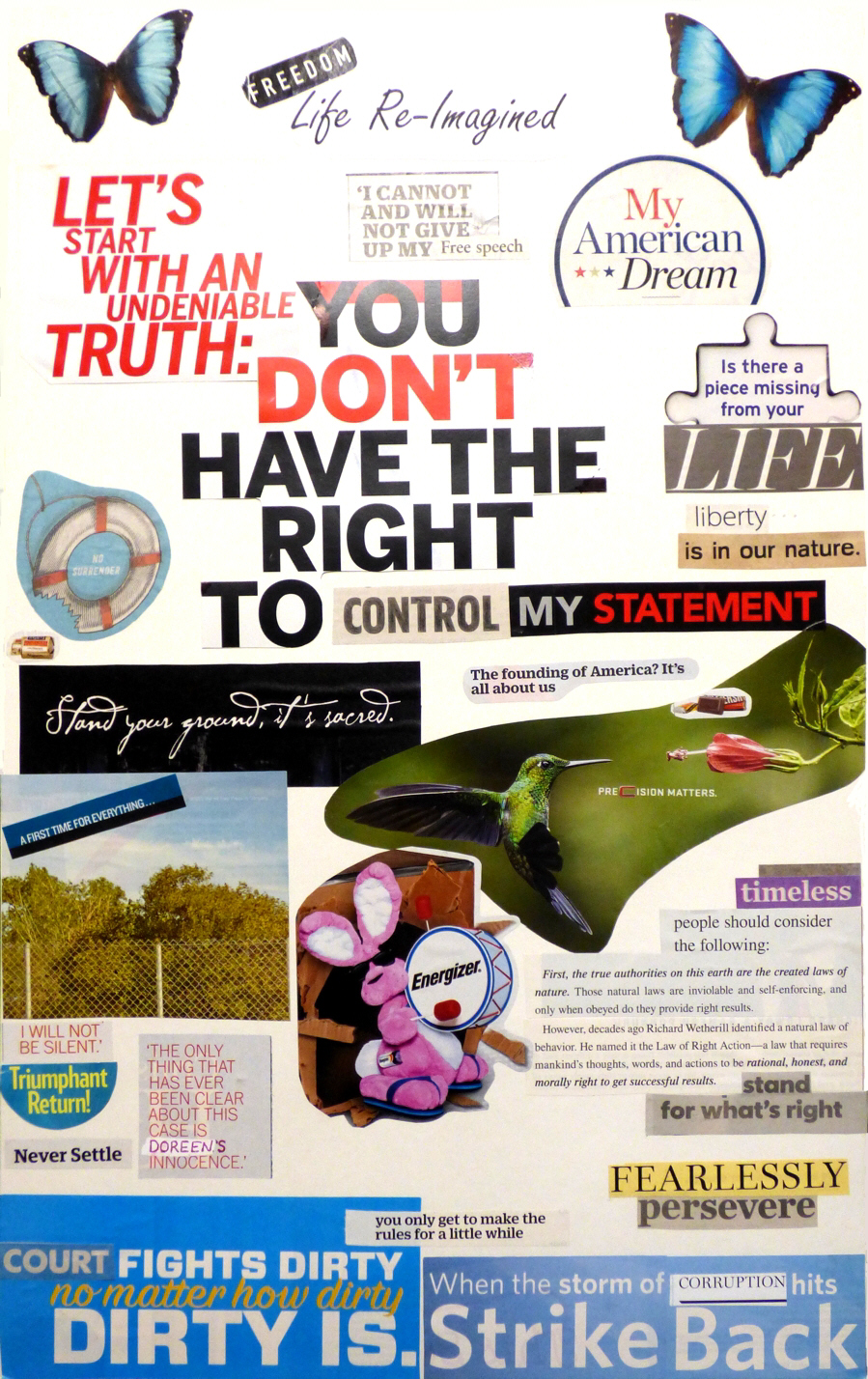 (By the way, I would very much welcome videos of any of you or your friends, acquaintances or random strangers on the street answering this same question, which I would then incorporate into this film in order to make it even stronger.) The History Of Doreen's Appeal You can find Doreen's principal appeal brief here. I encourage everyone to download it and read it through. It's an easy read, and not nearly as long as it will appear from the page count. Many pages are taken up with non-argument uses, and the argument portions are double-spaced and wide-margined, meaning that it doesn't take much text to fill a page. You will see-- beyond any doubt, and completely contrary to the troll and wormtongue community that have been trying to spin Doreen's "conviction" into some kind of attack on CtC-- that the "conviction" of Doreen was only achieved by reliance on deep corruption to overcome the complete lack of merit to the government's case. As such, the prosecution of Doreen-- which IS meant to be an attack on CtC, or at least, on people's perception of CtC-- is actually an acknowledgement of the truth about the tax, as can be seen by the following simple reasoning: There is no valid case against Doreen. Yet the government proceeded with its "prosecution" anyway, deliberately taking a series of law-defying steps in order to contrive a "conviction". This can only have been done in order to try to make an argument that cannot be made on legitimate grounds. This is axiomatic. Deceit, evasion and corruption are only resorted-to when truth, forthrightness and integrity will yield unwanted outcomes. The outcome wanted here by the deceivers is the furnishing the trolls and wormtongues with a press-release saying that, "The wife of Pete Hendrickson, author of 'Cracking the Code' was convicted..." (Needless to say, no mention is made in such a release of the shenanigans by which the "conviction" was accomplished-- only a fraction of which are included in this brief due to length-limitation rules and a few other factors.) The hope is that you would be somehow discouraged from spreading the word about CtC's revelations, or find it more difficult due to having one more thing to have to explain and clarify to a skeptical listener. But this brief is the perfect answer to that corrupt effort at fog-generation-- from it you can distill a bullet-point list of what the government actually had to do to contrive this "conviction" that it wants your listener to believe is reason for them to not examine CtC. By this you can make clear, in a nice bit of intellectual judo, that the effort is really the best evidence that your listener really, really needs to study CtC and learn what the government is so fearful of him or her discovering. See the government's evasive and mendacious response here, and Doreen's reply brief here-- it's a wonderful, short little exposure of the corruption and mendacity to which the DOJ was forced to resort in attempting to "respond" to the principal appeal brief. INTERLUDE January, 2016: SO, FOR THE PAST SEVEN MONTHS, Doreen has languished in a federal prison in Alderson, West Virginia, awaiting the outcome of her appeal (oral arguments are being heard in two weeks). While there, Doreen has been occupying her bleak time with some of the educational programs made available at the place. A project was required of those participating in one of those classes earlier this month-- the creation of a collage title "Life Re-Imagined". The object was to induce some sort of breast-beating, "How will I do things differently once I'm free again" self-criticism exercise by the women attending. But in one case, there was nothing to criticize... Here is Doreen's collage, which brought a unique, unanimous ovation from everyone in the class when she unveiled it for viewing: