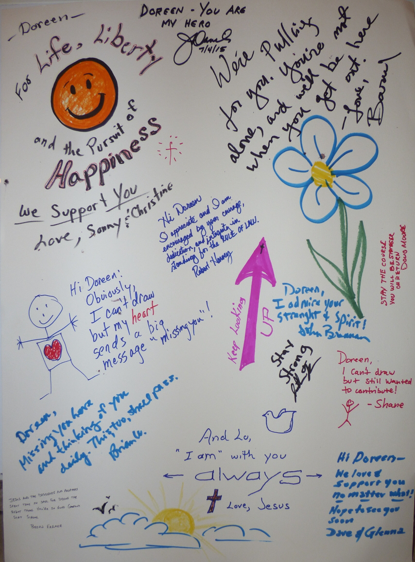(Find and share this on YouTube at http://youtu.be/IagZzFIIymw) The longer but much more comprehensive and question-answering backstory (the "why" history leading up to this unprecedented assault on the First Amendment and principles of due process) can be found here. WORLD NET DAILY has published a good article about Doreen's case. See it here. Here is our daughter, Katie, reading the allocution Doreen delivered at sentencing to the pre-programed judge and the spillover-into-the-hallway crowd of supporters on hand (thanks so much to all who attended):