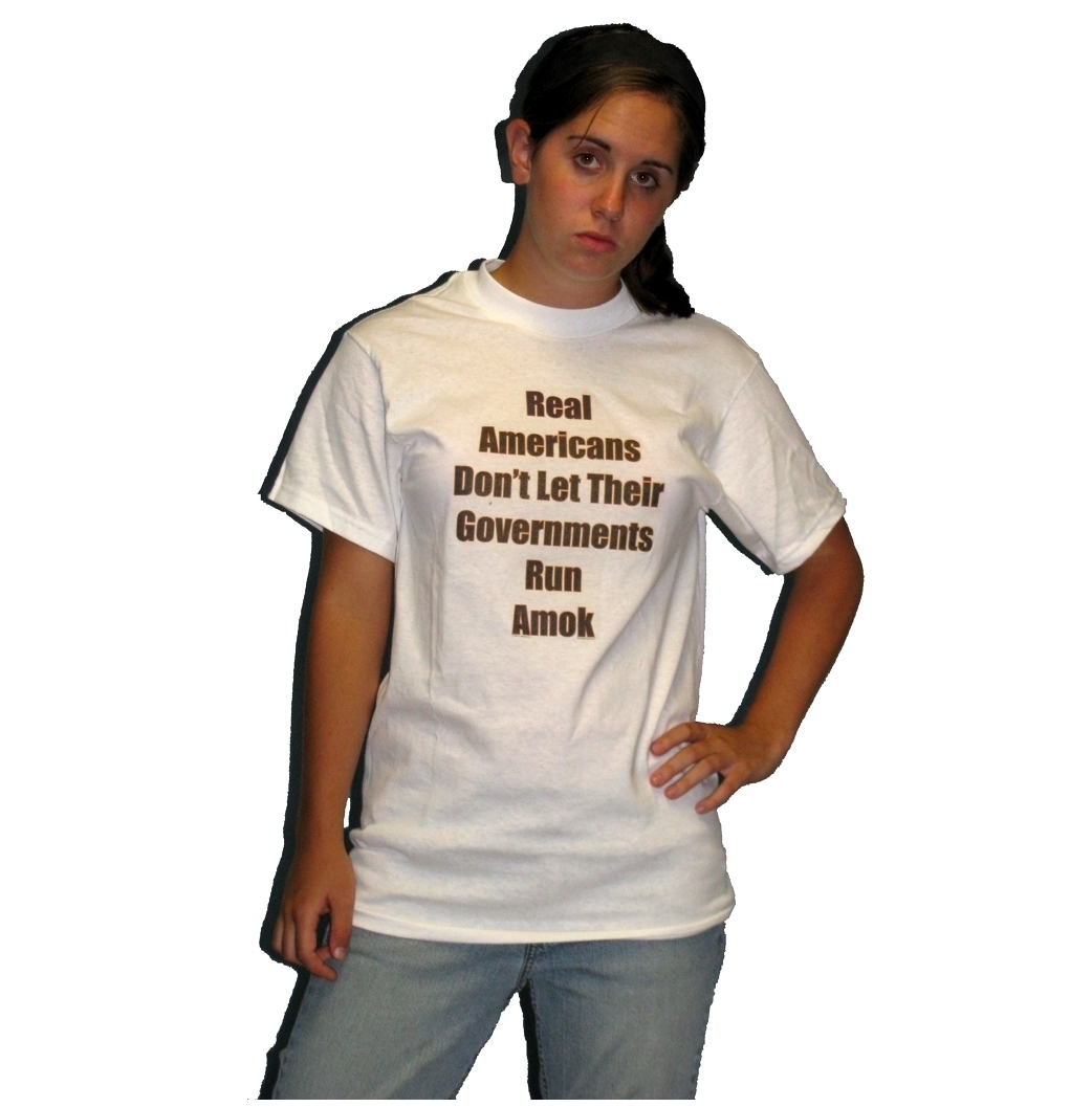 Wear this new T-Shirt proudly, and tell the enemies of the law that if they don't like Constitutional limits, they should find someplace else to live! Heavy-weight all-cotton quality T-shirt in your choice of adult M, L, or XL Just $25.00 |