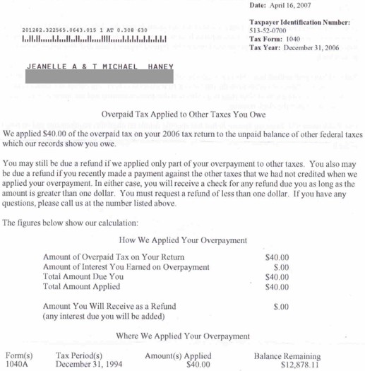 In an interesting expression of stress neurosis (or petulance) in response to Cathie and Erik's CtC-educated filing, the Treasury Dept. has kept back $500 from this refund for a "frivolous return" penalty, even while acknowledging that the return was perfectly proper, and processing it accordingly: