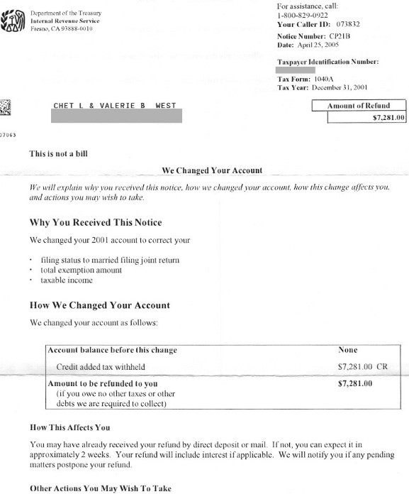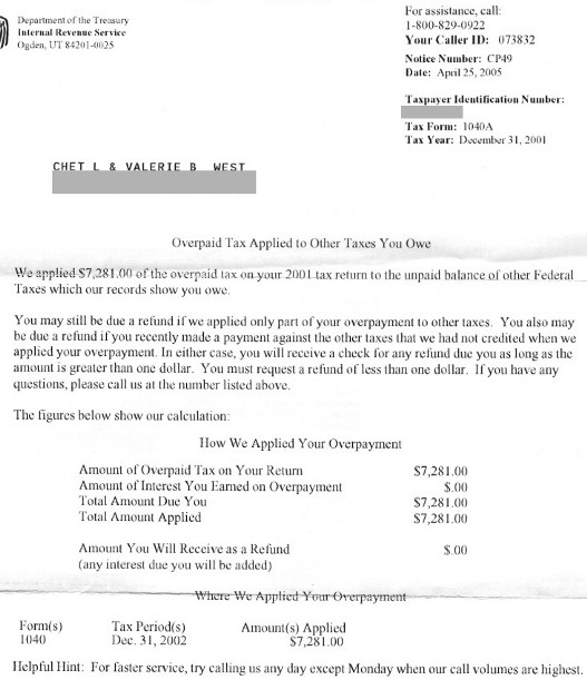 What follows is the notice Chet and Valerie received regarding the diversion of their refund; and their latest response. Enjoy. |