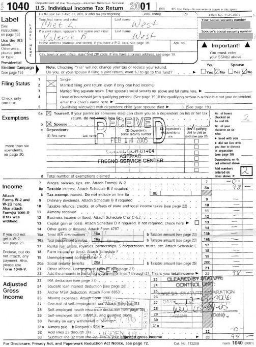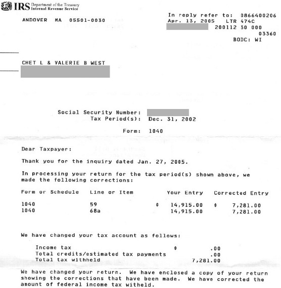 However, last December, a new element entered the picture. The West's had picked up a copy of 'Cracking the Code- The Fascinating Truth About Taxation In America', and learned what the revenue laws actually say. Armed with this transformational knowledge, Chet and Valerie filed new documents for 2001, declaring themselves to have received no "income", and claiming all withheld money as a refund. The government's response? Suddenly, the original return was declared to be acceptable after all, despite the jurat-nullifying addition! The 'service' proceeded to fuss with the return a bit, in an effort to suggest that this was business as usual. It accepted the West's originally report of $7281 withheld (which was only a portion of what was actually withheld, but remember, this was before the Wests read CtC and gained an understanding of what really qualifies as 'federal income tax withheld'), and recalculated their return slightly, proposing that the $1447 Chet and Valerie had computed as owed to them as a refund be reduced to $295.