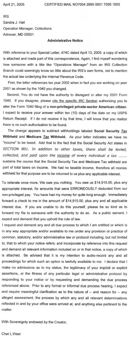About a month ago, I shared the story of the remarkable redemption of Chet and Valerie West's 2001 tax return. This was a return which had been completed in the 'conventional' way-- which is to say, in ignorance of the law, as the government prefers-- with one exception, which was the addition of the words "Under Duress" to the perjury statement on the form. As is permitted by law, the government refused to accept the return, and began a campaign of harassing the West's over a large alleged tax liability for that year, which the IRS took it upon itself to calculate on the West's behalf.