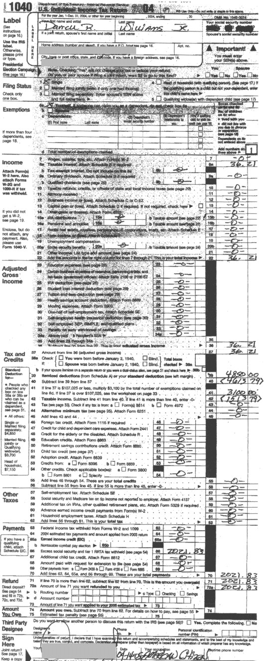 CtC Warrior Darrell Williams-- whose refund last autumn of $3,785.00 seized by federal "levy" was accompanied by a letter declaring that despite the return of his money, the government's records still indicated that he owed over $14,000 in unpaid taxes (see www.losthorizons.com/tax/Misunderstandings/AllUpperCase.htm)-- has received a formal acknowledgement that although he earned over $26,000.00 during 2004, his total amount of "income" received during that period was only $36.00. Darrell has generously shared the relevant documents: